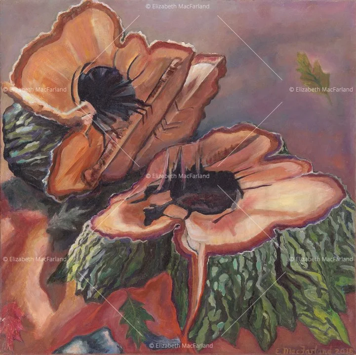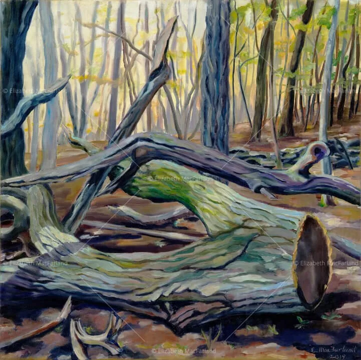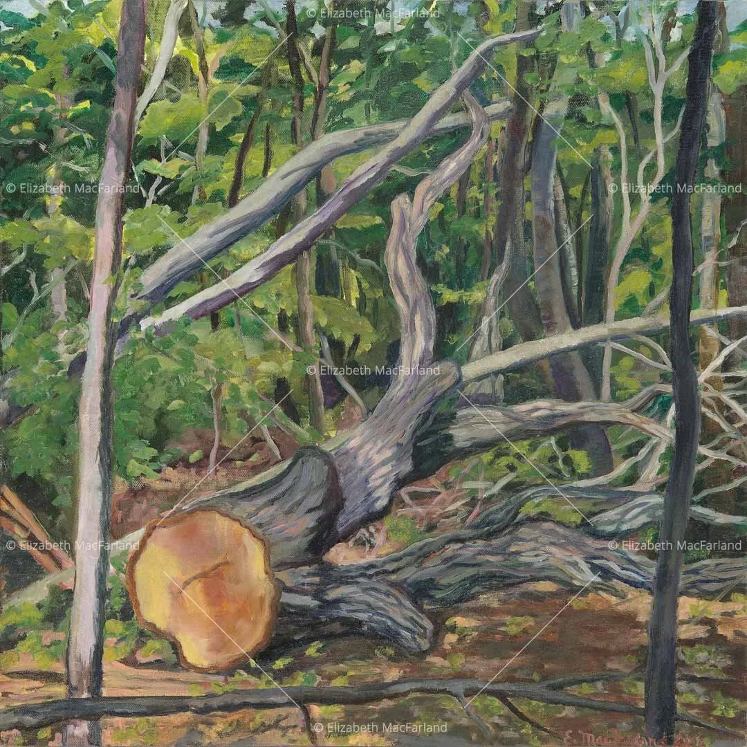 I was in mourning when I ventured back to witness the destruction. Downed limbs were everywhere, and spring sap was rising up onto stumps with nowhere to go. I decided I wanted to chronicle their life and death by painting them, and headed back almost daily into the woods with brush and canvas.