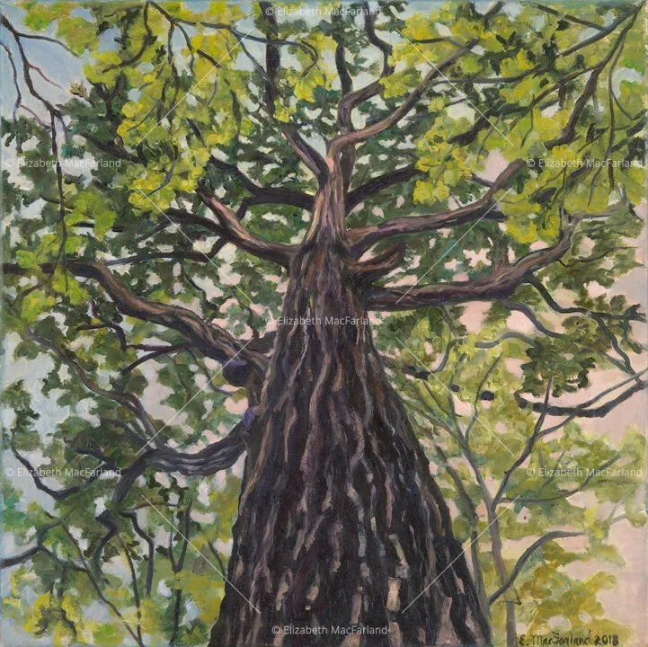 The tree depicted in “Civil War Sapling” is one we saved, and we call her “Big Beauty”. We make daily sojourns to sit beneath her and are grateful she still stands. Humans have grown very accustomed to thinking of flora and fauna as existing for our own use, without enough thought given to the ramifications of our actions. There are other ways that flora and fauna benefit us, which we shouldn’t forget. When we sit beneath “Big Beauty” in stillness we can feel another dimension of belonging that whispers of our rightful place in the ecosystem.